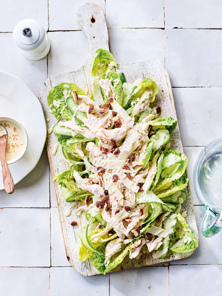 Salade van rodekool met rozijnen, Parmezaanse kaas en gelakte kalkoensaté