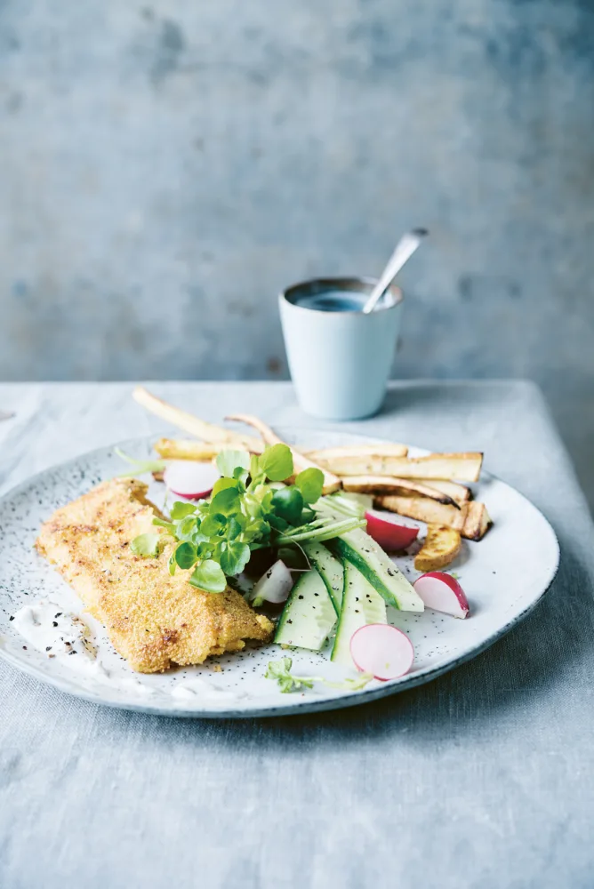 FODMAP Fish and chips met frisse tartaarsaus, komkommer en waterkers