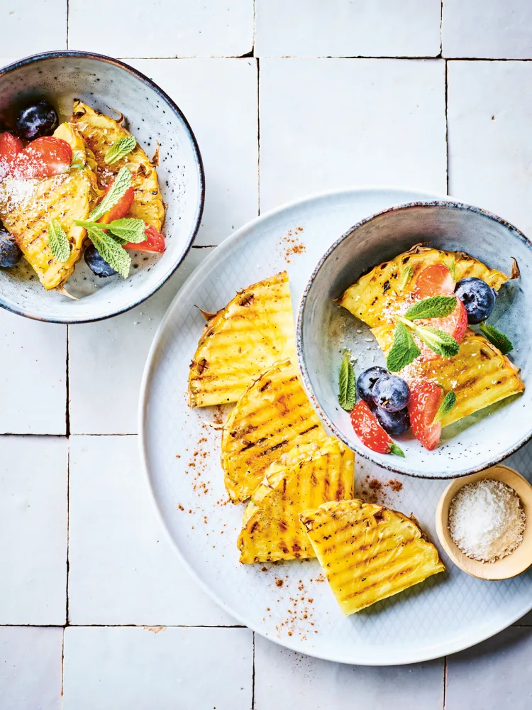 FODMAP Gegrilde ananas met kokos en blauwe bessen