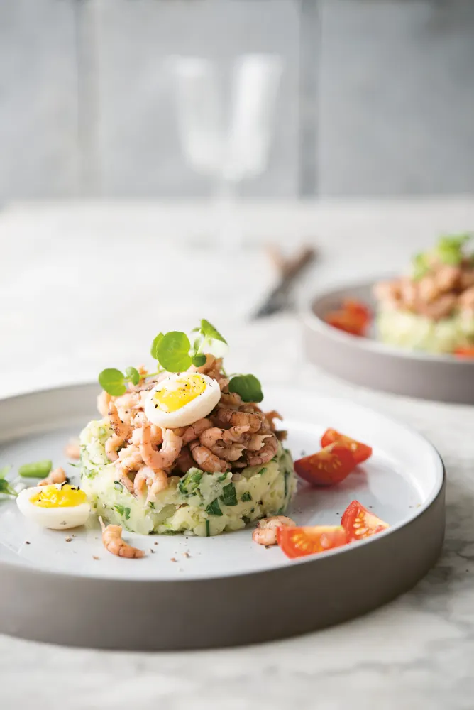 FODMAP Geplette aardappel met garnalen en tuinkruiden