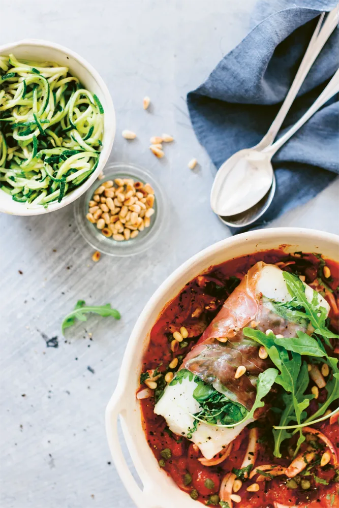 FODMAP Kabeljauwfilet in parmaham met Siciliaanse tomatensaus