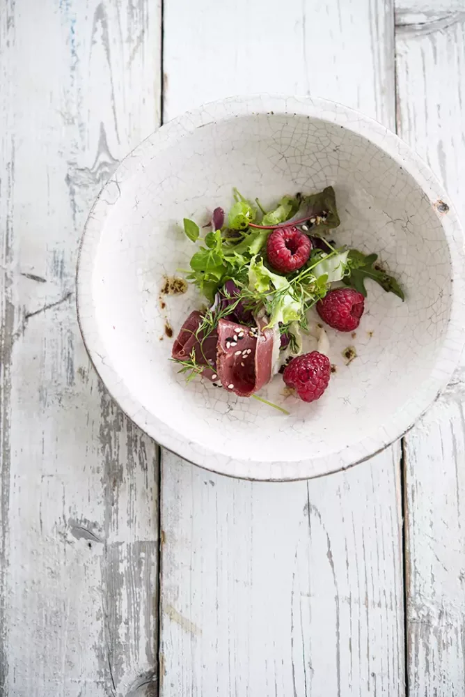 FODMAP Hapje magret de canard met jonge sla en frambozen