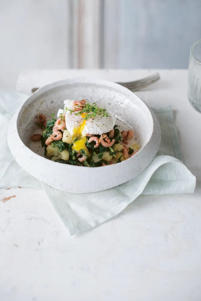 FODMAP Stoemp van boerenkool met gepocheerd ei en garnalen
