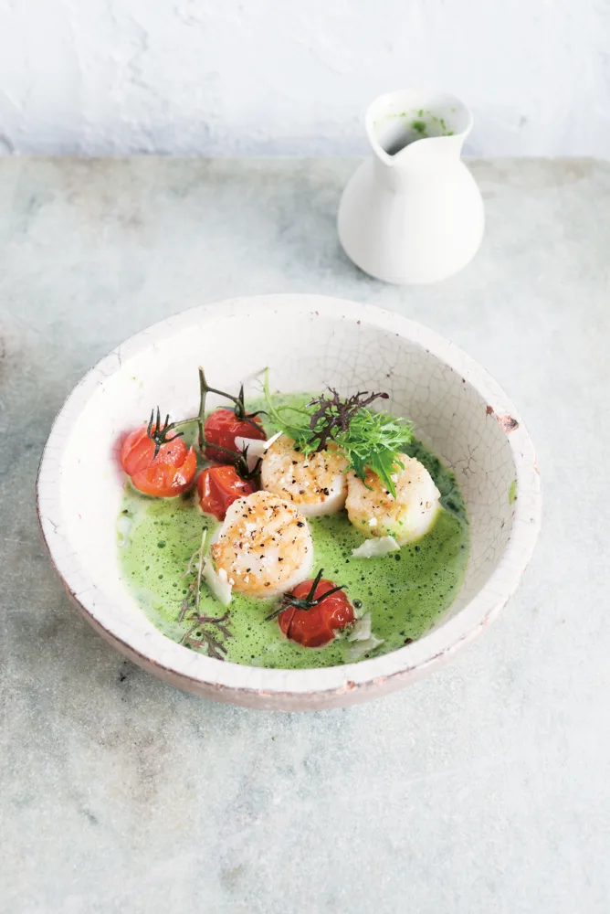 FODMAP Sint-Jakobsvruchten met een frisgroen sausje en tomaatjes