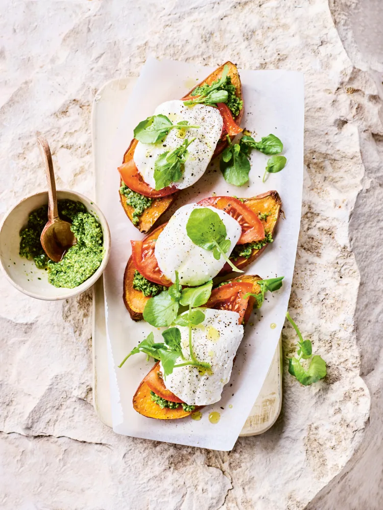 FODMAP Toast van zoete aardappel met tomaat, mozzarella en waterkerspesto